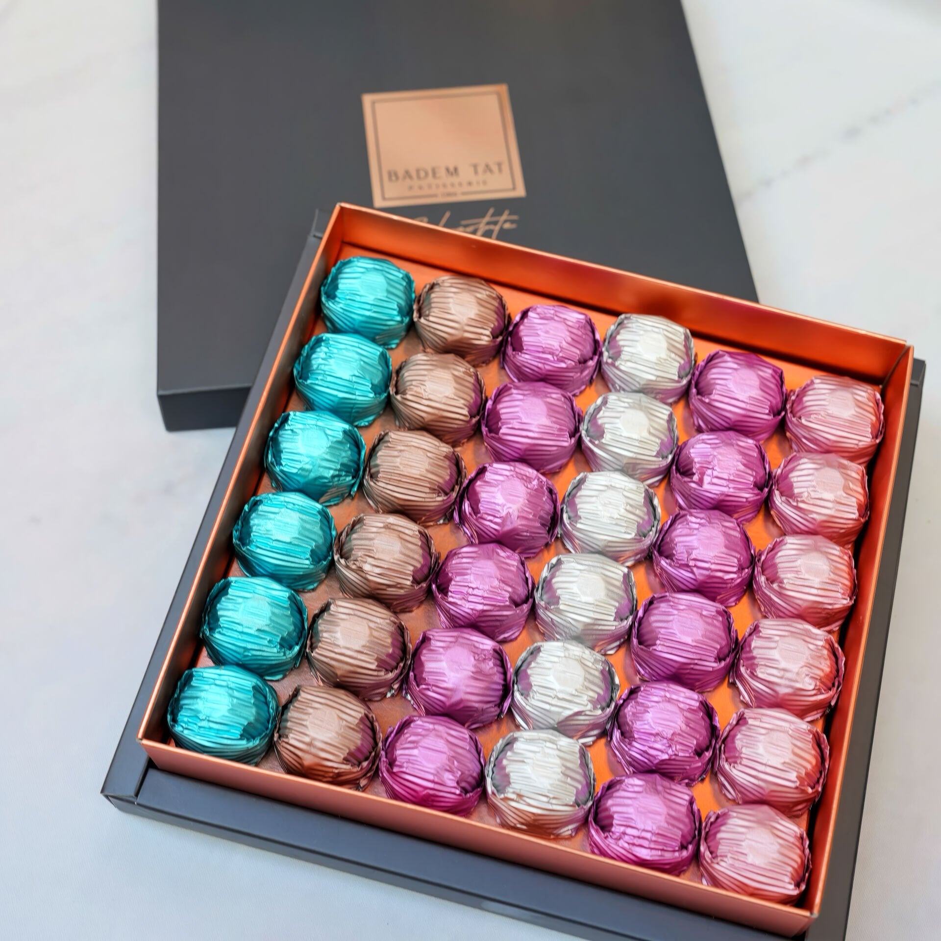 Yaldızlı paketlerinde sunulan çikolatalar, fıstıklı ve fındıklı çeşitlerden oluşur. Özenli sunumu ve dengeli lezzetiyle öne çıkar.